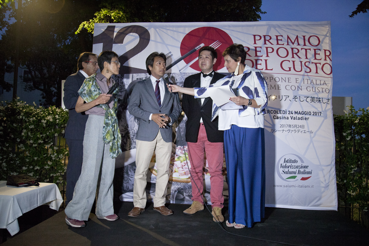 I Reporter del Gusto 2017, celebrati a Roma alla Casina Valadier il 24 maggio, sono 9 e si sono distinti per aver scritto e parlato di salumi italiani in maniera completa, corretta e, in molti casi, entusiasta: Shigeru Hayashi di FoodLife, Masakatsu Ikeda di Ryori Okoku, Hiroko Nakamura di Kyushu’s table, Cindy Suzuki della trasmissione radiofonica Grow & Glow. Oltre alle firme giapponesi, l’edizione 2017 è andato anche 5 ‘firme’ italiane, selezionate per la loro opera di divulgazione sul tema salumi: Chiara Giallonardo di Linea Verde (Raiuno), Paola Ferazzoli di Porta a Porta (Raiuno), Maria Teresa Lamberti di Mary Pop (Radio Rai1), Alessandro Libri corrispondente ANSA da Tokyo e il Dr. Luca Piretta, medico-chirurgo specialista in Gastroenterologia ed Endoscopia Digestiva, che sulle pagine del mensile Sano&Leggero ha affrontato il lato nutrizionale dei salumi in maniera esaustiva, rassicurante e puntuale.