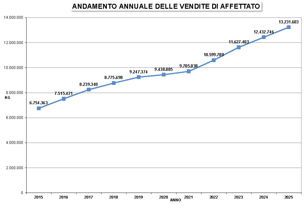 8 aprile 2026 – Con oltre 40 milioni e 700 mila Kg prodotti nel 2025 (fonte: IFCQ Certificazioni), la Mortadella Bologna IGP registra un incremento della produzione del 3,0% rispetto all’anno precedente e del 3,3% dei volumi di vendita. Inarrestabile il gradimento dell’affettato che con +6,4% conferma un fenomeno ormai consolidato, che ha visto più che raddoppiare i volumi negli ultimi 10 anni, passati dai 6 milioni e 700mila Kg lavorati nel 2015 agli oltre 13 milioni e 200mila Kg del 2025.