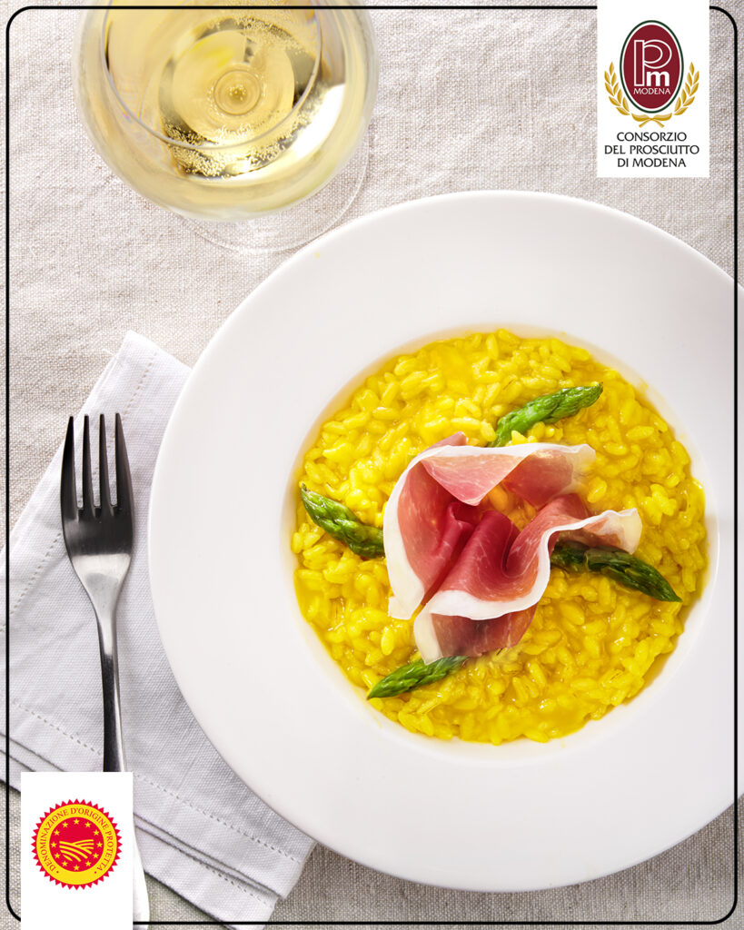 Per celebrare l’arrivo della primavera, vi proponiamo un cromatico risotto dove la freschezza degli asparagi di stagione incontra la luce dorata dello zafferano per fare da palcoscenico al vero protagonista del piatto: il Prosciutto di Modena DOP, la cui sapidità dolce e raffinata eleva ogni chicco in un perfetto equilibrio di profumi e aromi.