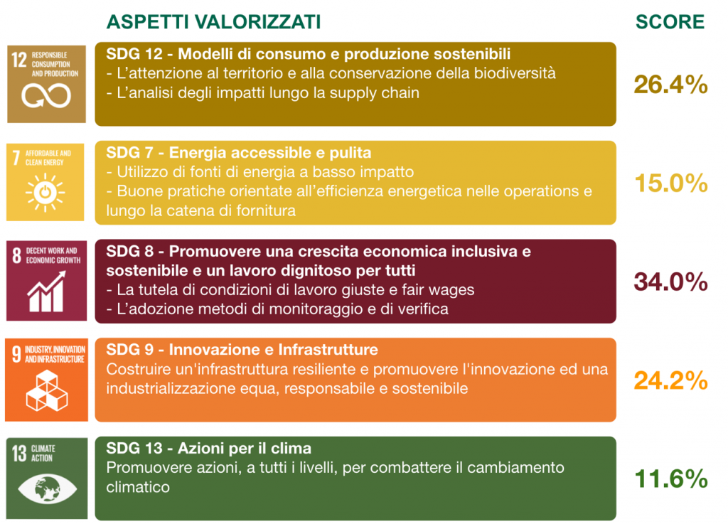 Le aziende sono state dunque guidate dagli esperti di Nativa nell’individuazione delle azioni interne ed esterne già in uso o da mettere in campo – espresse in termini percentuali – per migliorare il proprio profilo di sostenibilità in relazione agli SDG’s individuati. Dall’analisi è emerso che attualmente le aziende del settore sono maggiormente attive sul Goal numero 8 (34%), subito seguito dal Goal 12 (26,4%) e dal 9 (24,2%). Ancora ampi margini di miglioramento per quanto concerne il Goal 7, sul quale le aziende partecipanti allo studio riconoscono di offrire al momento un contributo pari al 15%.
